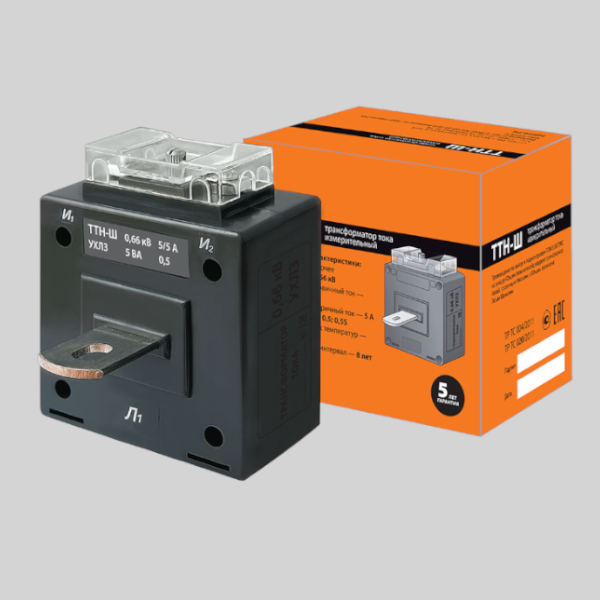 ТТН-Ш трансформатор измерительный, со встроенной шиной, предназначенной для подключения силовых проводов или шин представляет собой магнитопровод с намотанной на нем вторичной обмоткой, заключенный в литой пластмассовый корпус, не поддерживающий горение. На выводы вторичной обмотки трансформатора устанавливается прозрачная крыша, позволяющая надежно опломбировать клеммы.